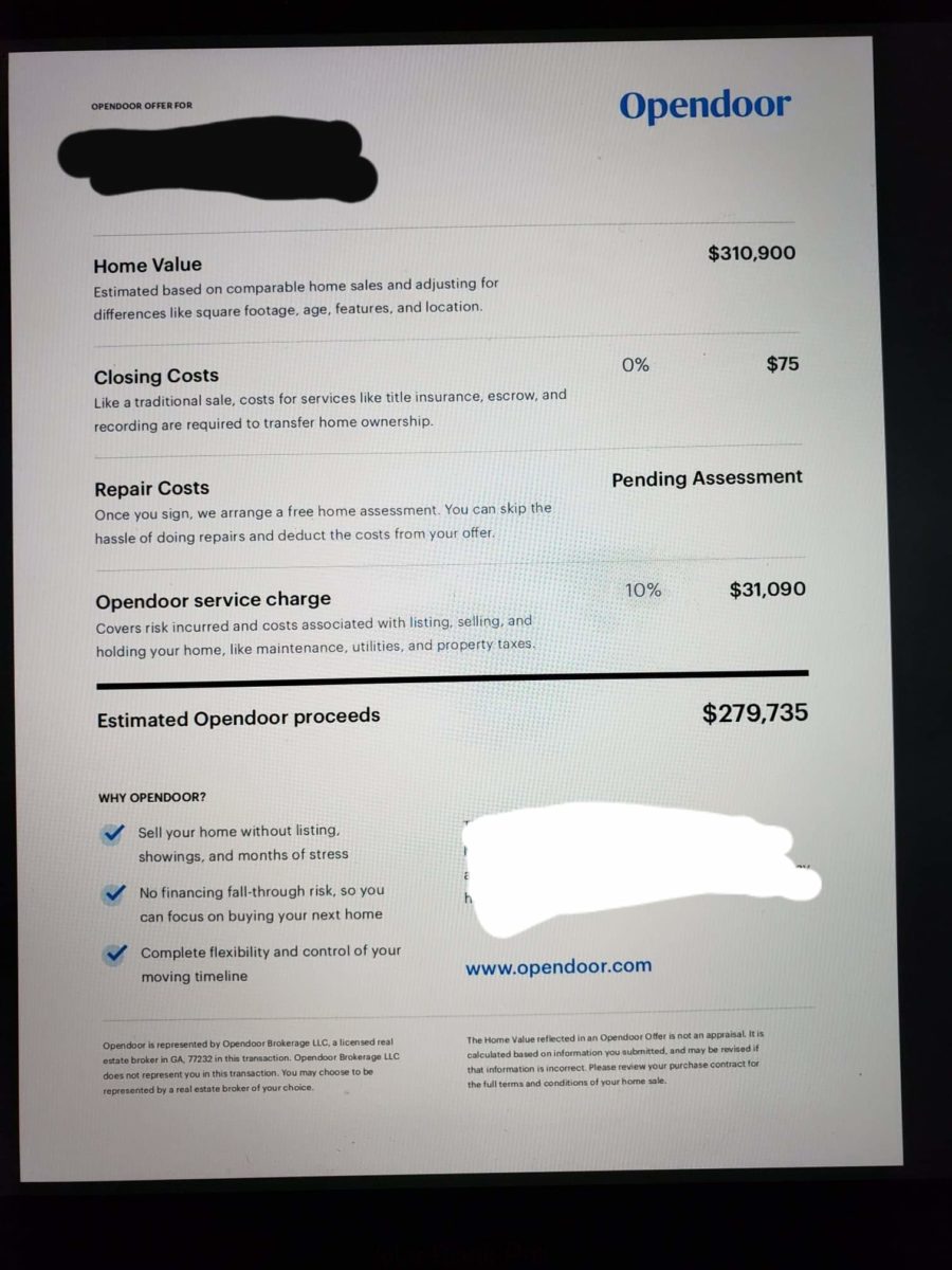Below are pictures of a real Opendoor offer we obtained for a client. They wanted to explore all options before deciding how they would like to approach selling their home. They decided to sell on the traditional market with us. Less than 6 days on the market and their home sold for $335,000. Opendoor was only giving them $310,000 before all their deductions.