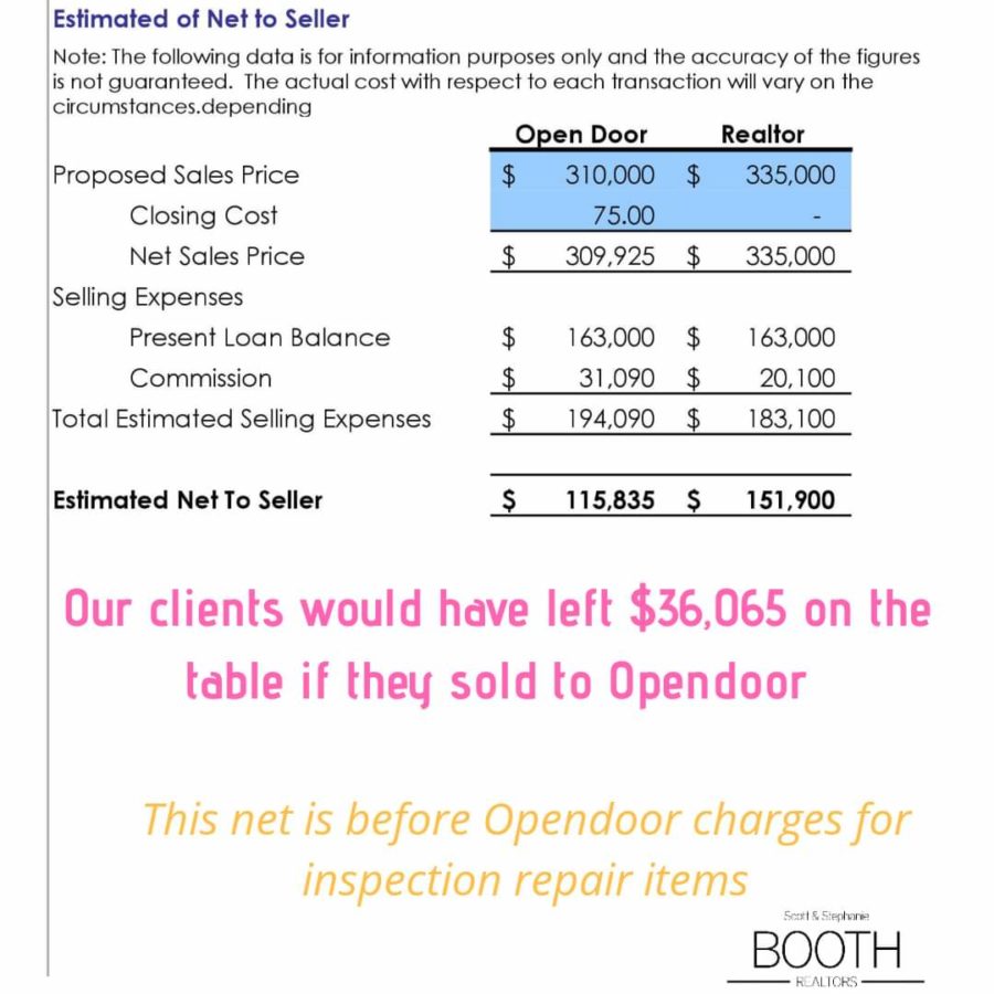 I also did a net sheet breakdown of the Opendoor offer vs. Realtor sold net. It’s in the pictures below. Our clients would have left $36,065 on the table had they sold to Opendoor.🤦♀️ They probably would have left more on the table because who knows how much Opendoor would have charged them for inspection repair items.